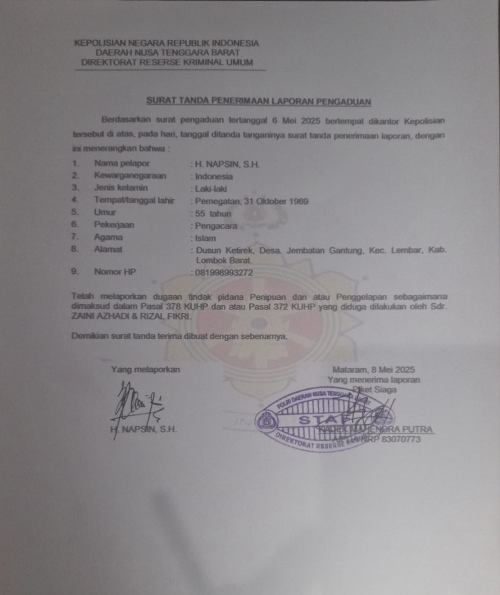 pada hari kamis, 08 Mei 2025 melalui Kuasa Hukum H. Napsin, SH Faisal Marwan telah melaporkan dugaan tindak pidana penipuan dan atau penggelapan sebagaimana dimaksud dalam pasal 378 KUHP dan atau pasal 372 yang di duga di lakukan oleh saudara Zaini Azhadi & Rizal Fikri.